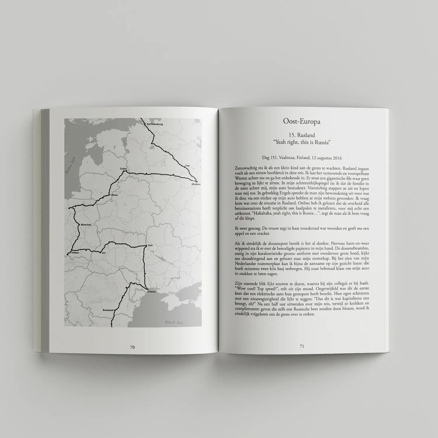 De toevoeging van kleurenfoto’s aan het einde werkt goed. Ze vormen een waardige afsluiting van de lange reis die je eerder alleen via tekst en kleine snapshots volgde. Het overzicht van statistieken – het aantal dagen, landen, kilometers, laadbeurten, visums en allerlei onverwachte feiten – maakt het geheel concreet en compleet.